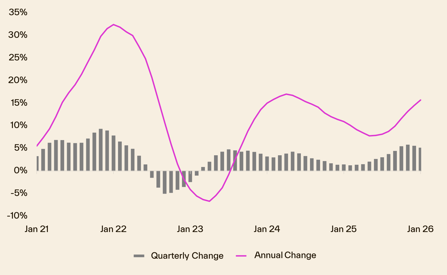 Brisbane house price growth over the last 5 years has followed a two-stage pattern: a strong COVID-era boom, a milder rates-driven cool-off in 2022, and then a renewed upswing into 2024–2025. As of Feb 2026, Cotality data shows that dwelling values were up by +1.6 per cent in January, +5.1 per cent over the quarter, and +15.7 per cent over the year, with values sitting at a record high.