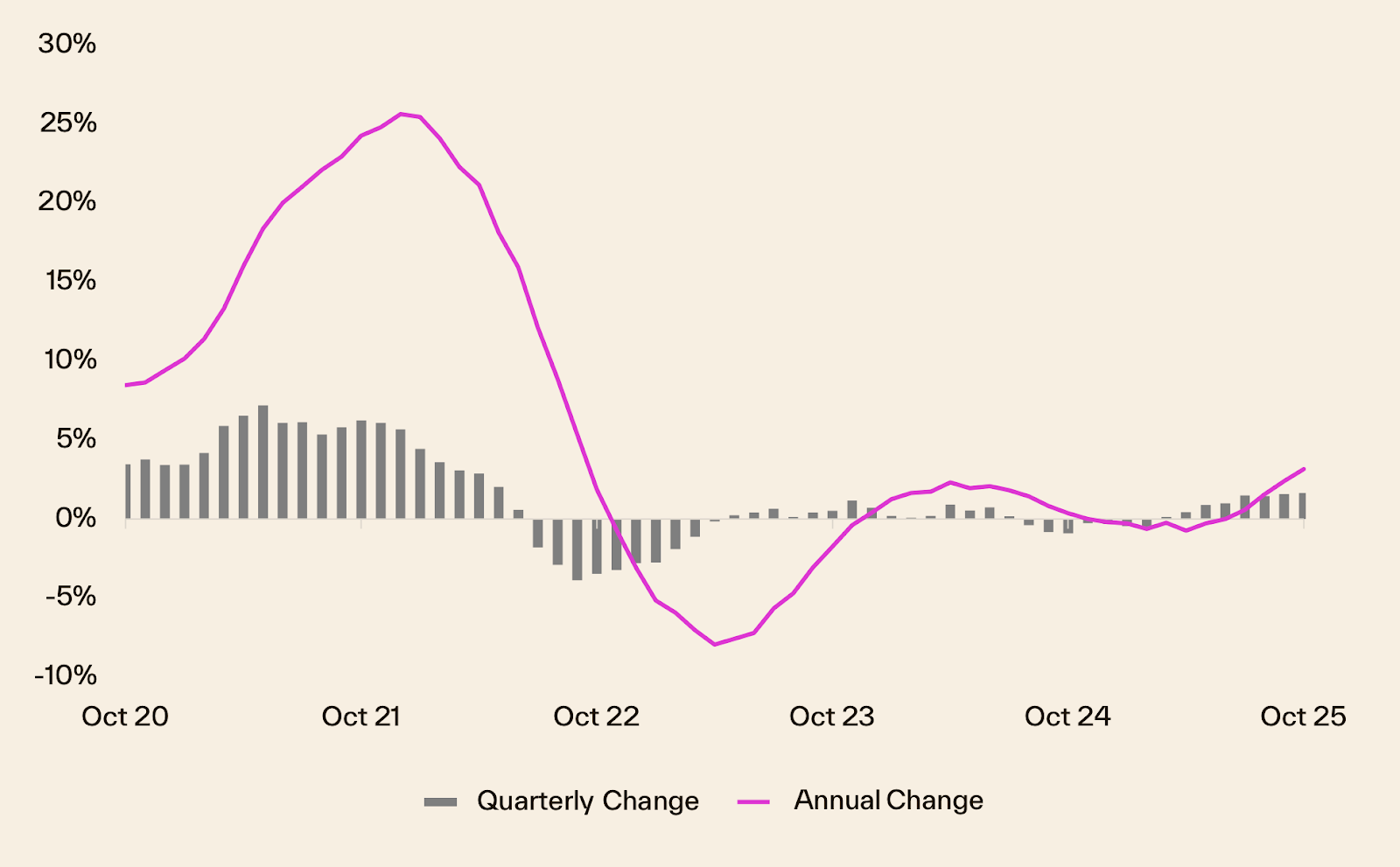 In October 2025, Canberra's property values continued their upward trend. The median value for all properties climbed by +0.6 per cent over the month, leading to a quarterly increase of +1.7 per cent. Over the past year, property values have grown by +3.2 per cent, with the median value reaching $877,937.