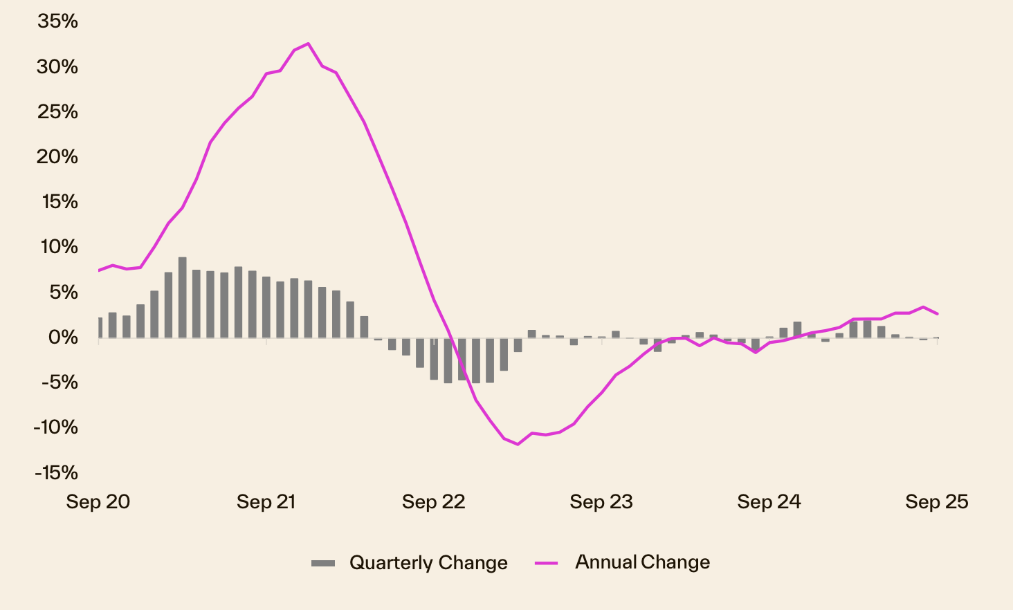 | Property type | Month change (Sep 25) | Quarter change (Sep 25) | Annual change (Sep 25) | Current median price (Sep 25) |