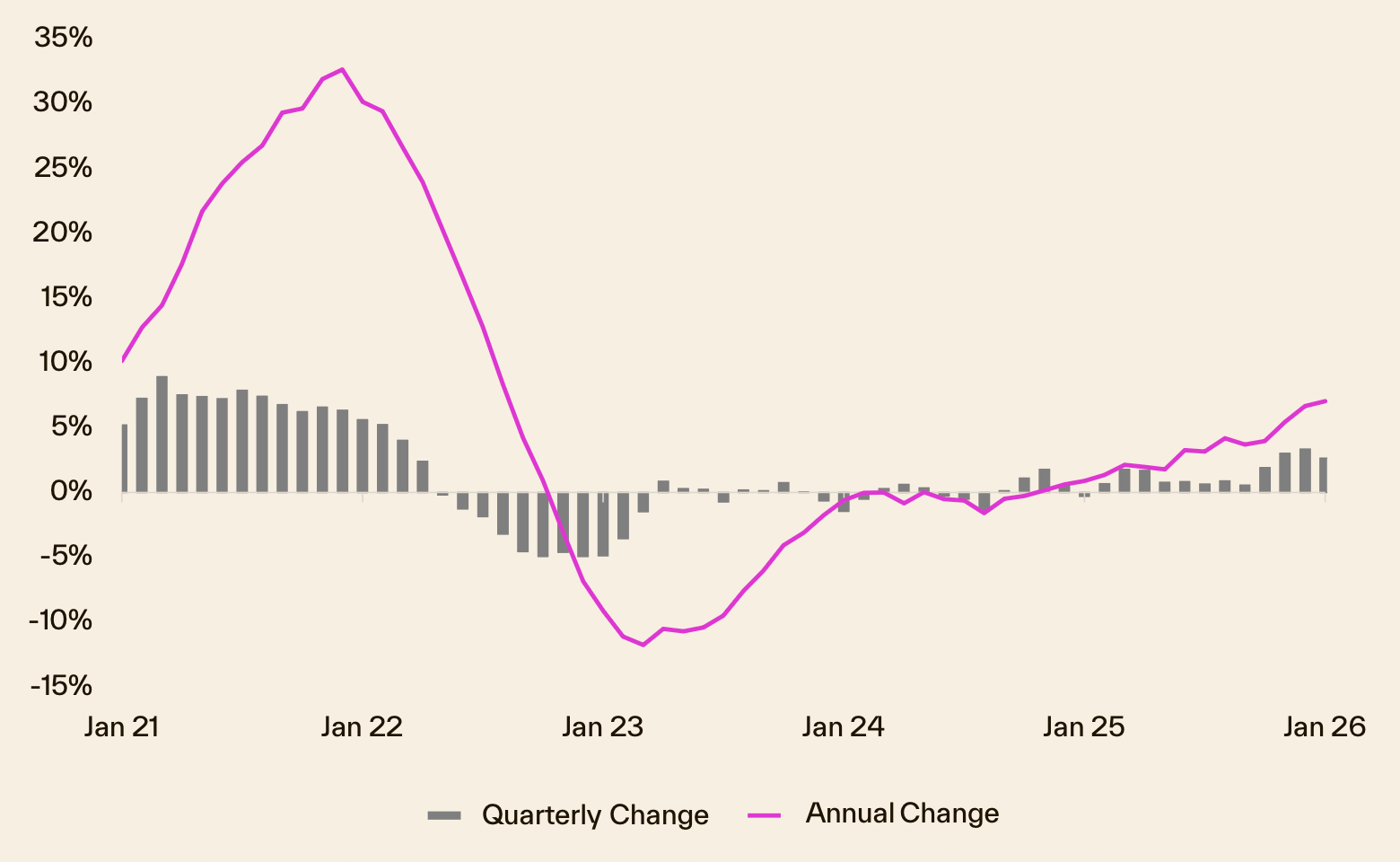 - Supply and demand: Advertised listings are around -31 per cent year-on-year, keeping supply tight and supporting recent price gains, while rolling quarterly sales activity was slightly higher, showing demand is still present.